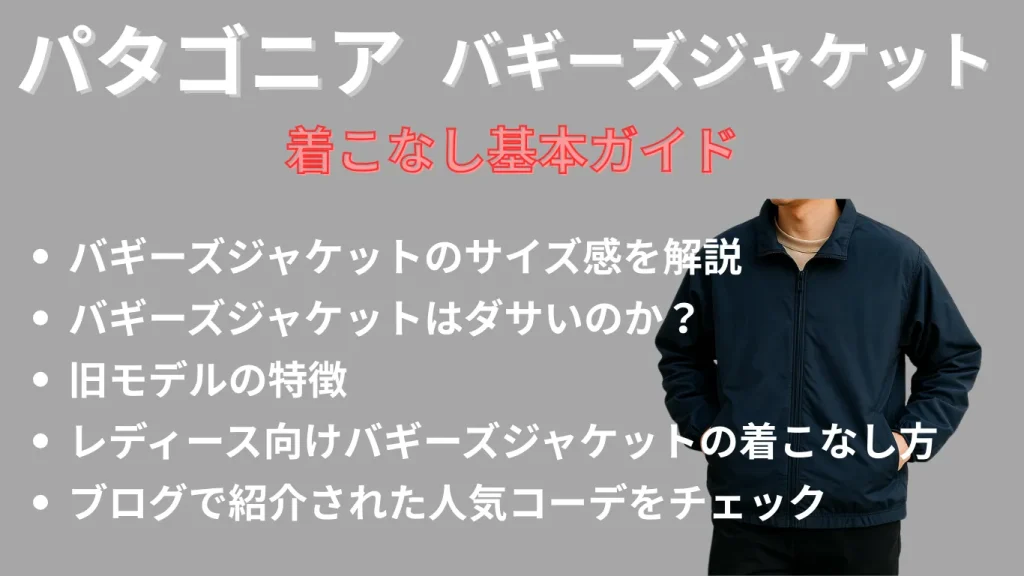 パタゴニアバギーズジャケットの着こなしに悩んでいる方に向けて、この記事ではサイズ感やおすすめのスタイリングをわかりやすく解説します。