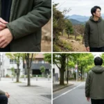 - 身長170cm〜175cmの方:MまたはLサイズ ここが一番悩むゾーンです。Mサイズならすっきりとしたジャストサイズで着られますが、厚手のパーカーを着ると脇の下が窮屈になる可能性があります。Lサイズだと着丈73cmでお尻が半分以上隠れるため、防寒性は高いですが、街着としては少し「着られている感」が出るかもしれません。個人的には、インナーの自由度を考えてLサイズをおすすめしたいところです。